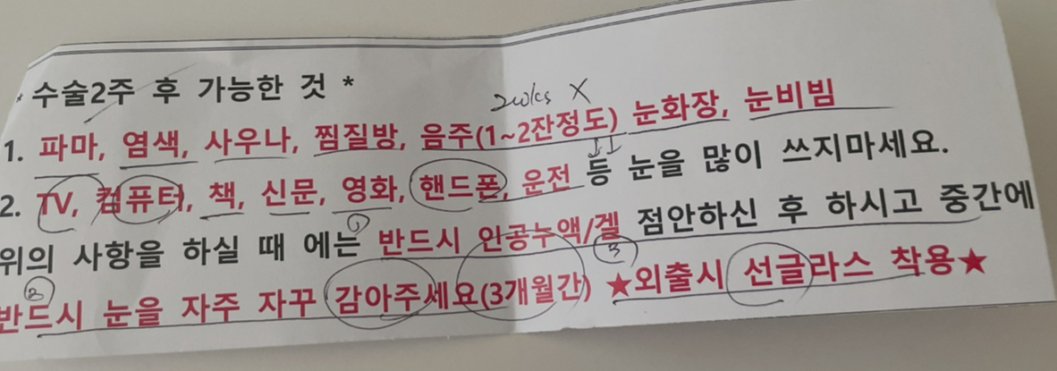 그 후 선생님께서 친절하게 2주 후부터 가능한 것에 대해 설명해주시고 한 달 후 그리고 4개월 후 예약을 한 뒤 병원을 나오게 되었습니다. 이날부터 약도 2종으로 줄어들고 하루 2회 점안만 하면 돼서 점심시간에 회사에서 안약을 안 넣어도 돼서 편해졌습니다!
